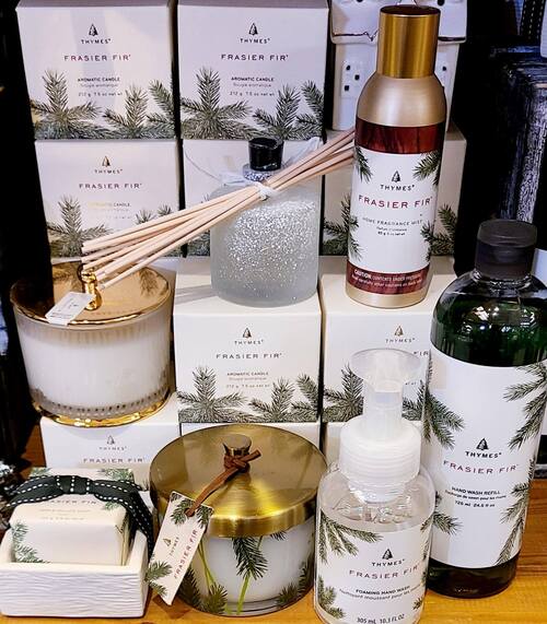 Frasier Fir candles and room scents from Thymes - one of our bestsellers! The best "evergreen" scent for the holidays.